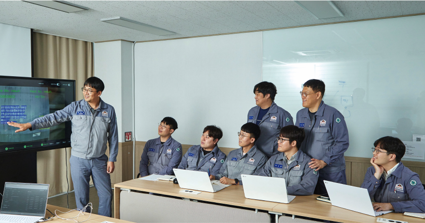 이를 위해 SMART기술팀은 현장 직원들을 위한 DX·AI 교육 프로그램을 운영해 스마트 기술 활용 역량을 높이고 있다. 단순한 기술 습득을 넘어, 배운 내용을 실제 현장의 문제 해결에 적용할 수 있도록 교육과정을 설계하는 것이다. 동시에 SMART기술팀의 전문성 강화를 위한 노력도 병행하고 있다. 국내외 유수 컨퍼런스 참가 및 전문 교육과정을 통해 최신 기술 동향을 지속적으로 학습하는 한편, 외부 전문가 자문과 선도 기업 사례 벤치마킹을 적극적으로 추진하며 실질적인 지식과 경험을 폭넓게 교류하고 있다. 더불어 수평적인 내부 소통과 지식 공유를 통해 다양한 의견이 건설적으로 오가는 조직 문화를 만들어가고 있다.